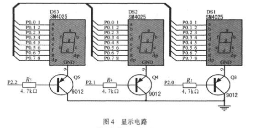 顯示模塊用于顯示溫度值,如圖4所示,由驅(qū)動電路和數(shù)碼管組成。顯示電路采用七段共陰數(shù)碼管掃描電路。節(jié)約了單片機(jī)的輸出端口,便于控制程序的編寫。